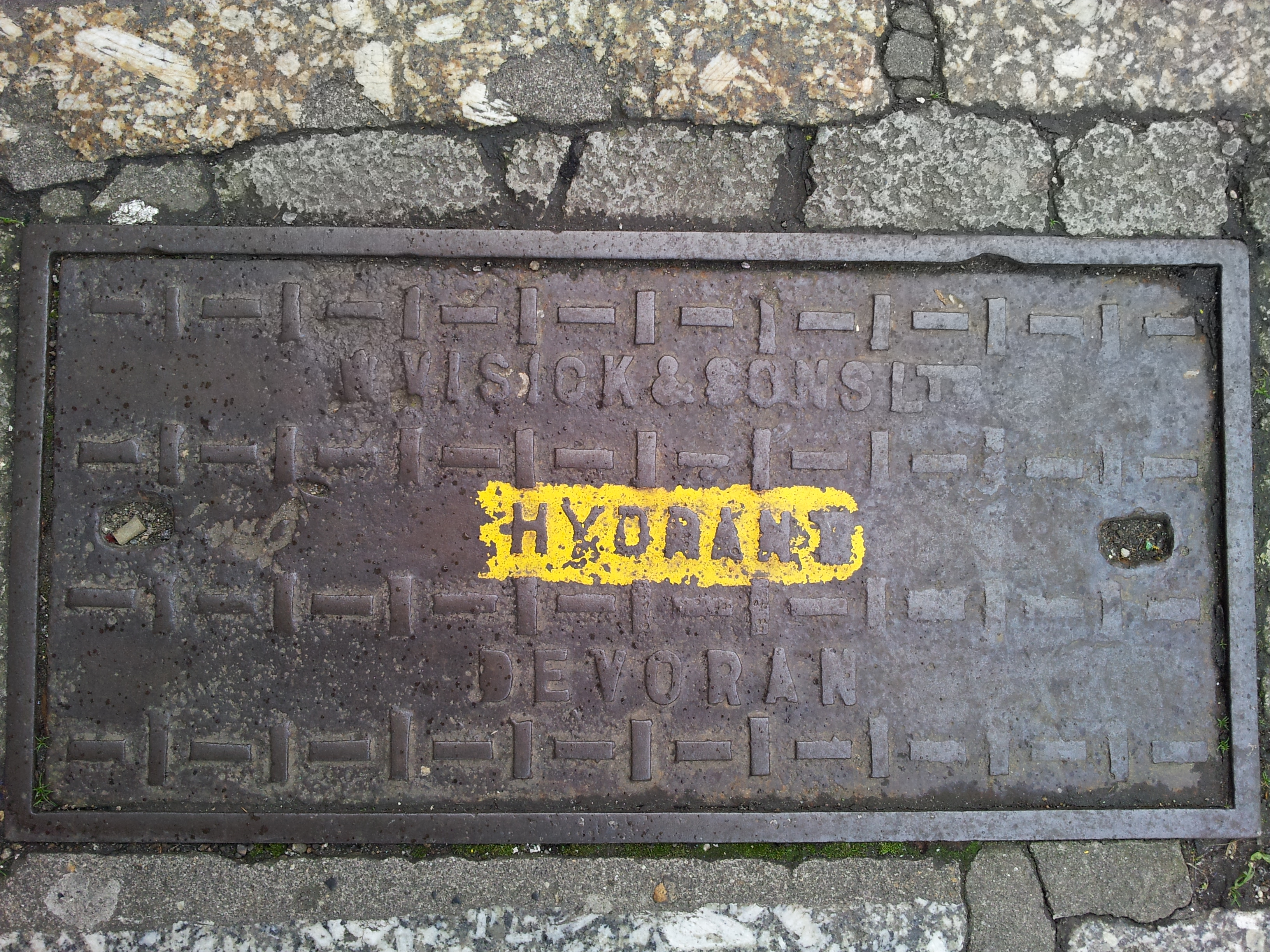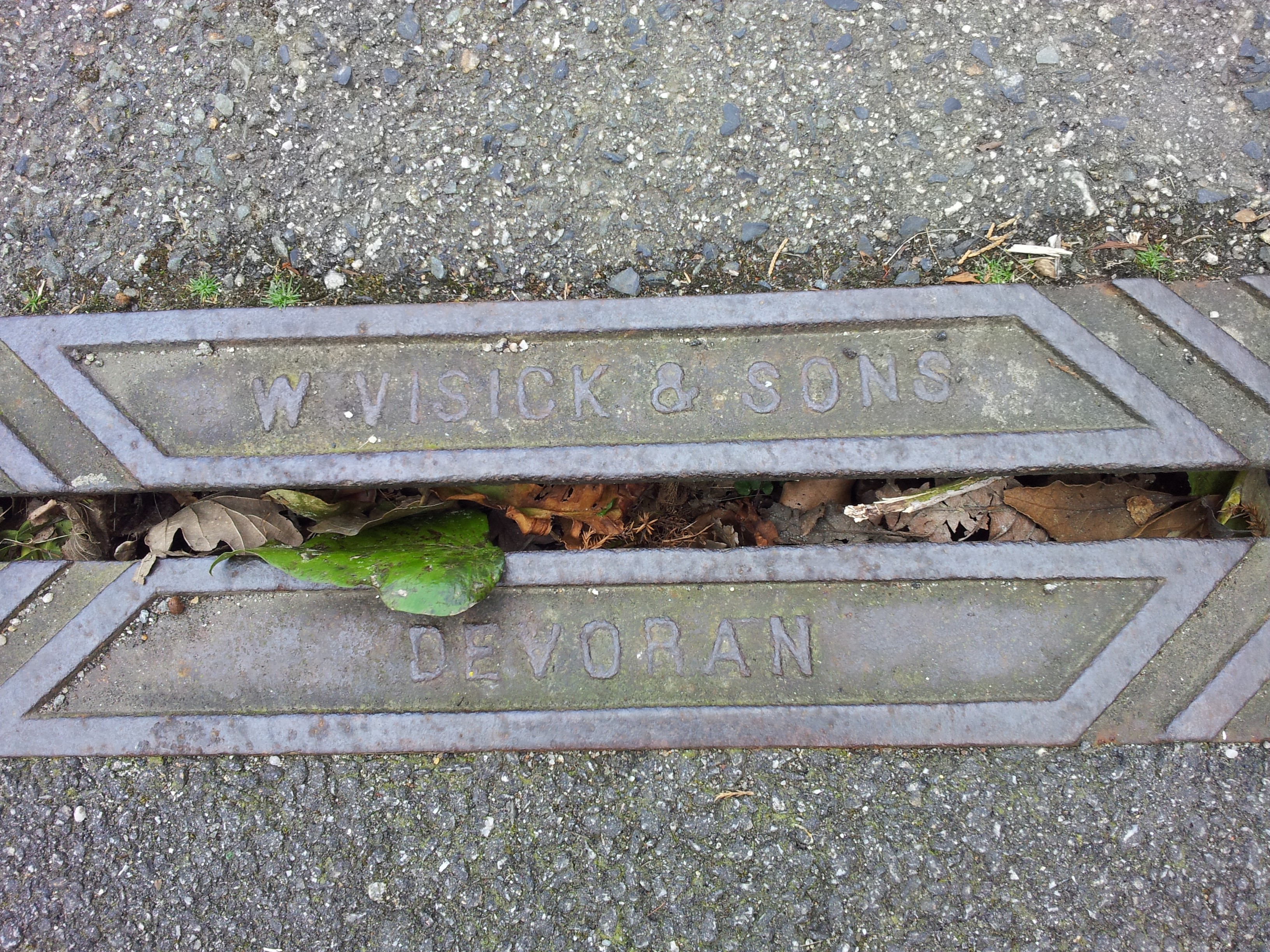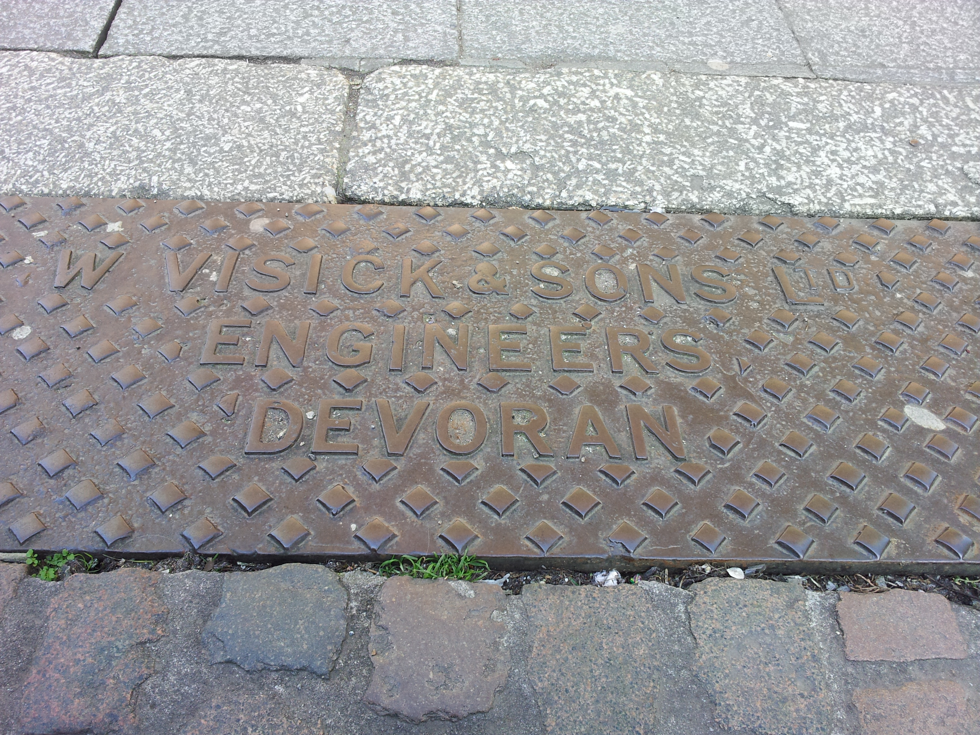 The mark of W. Visick and Sons Devoran on a pavement train, Avondale Road, Truro.
