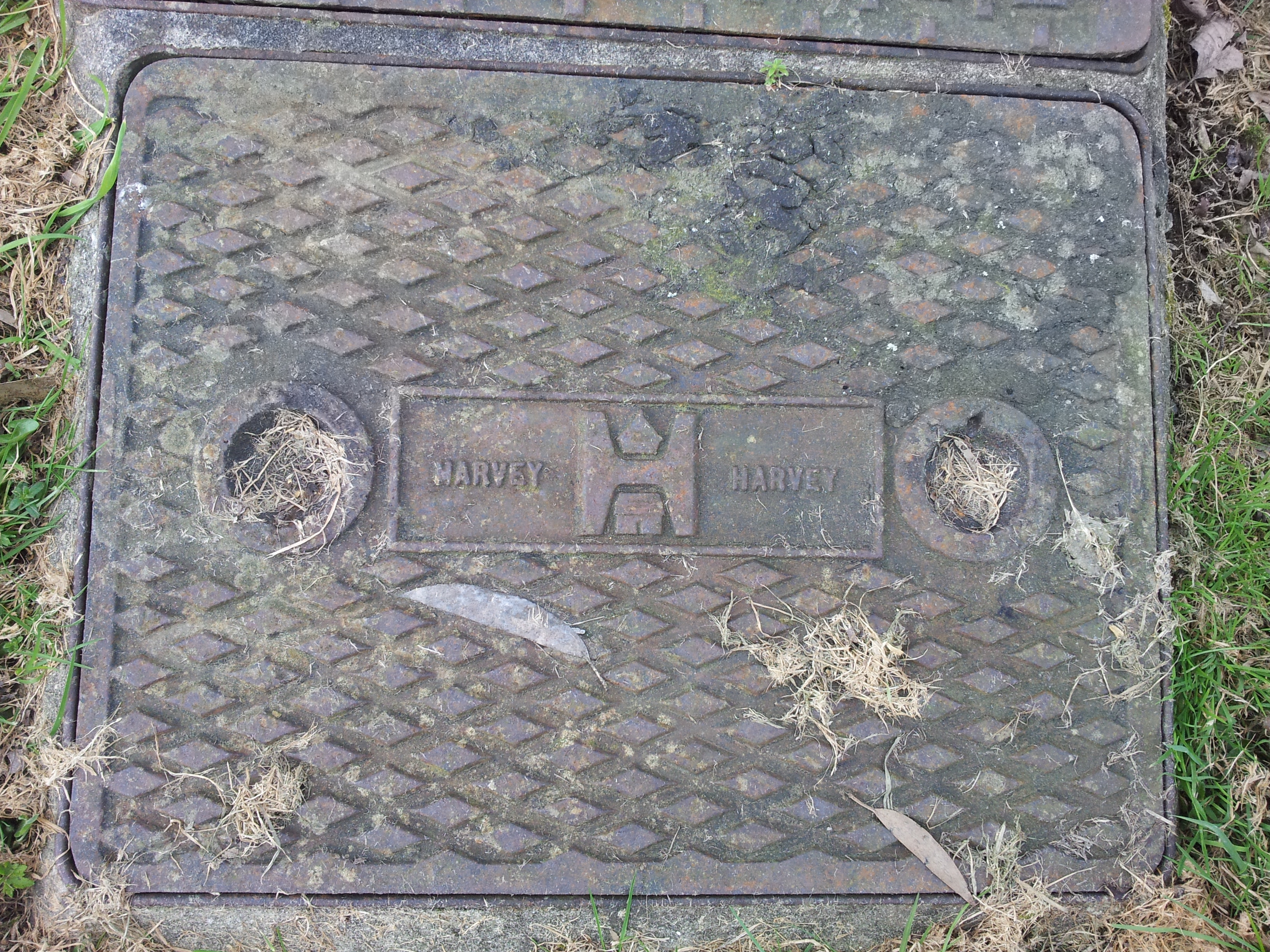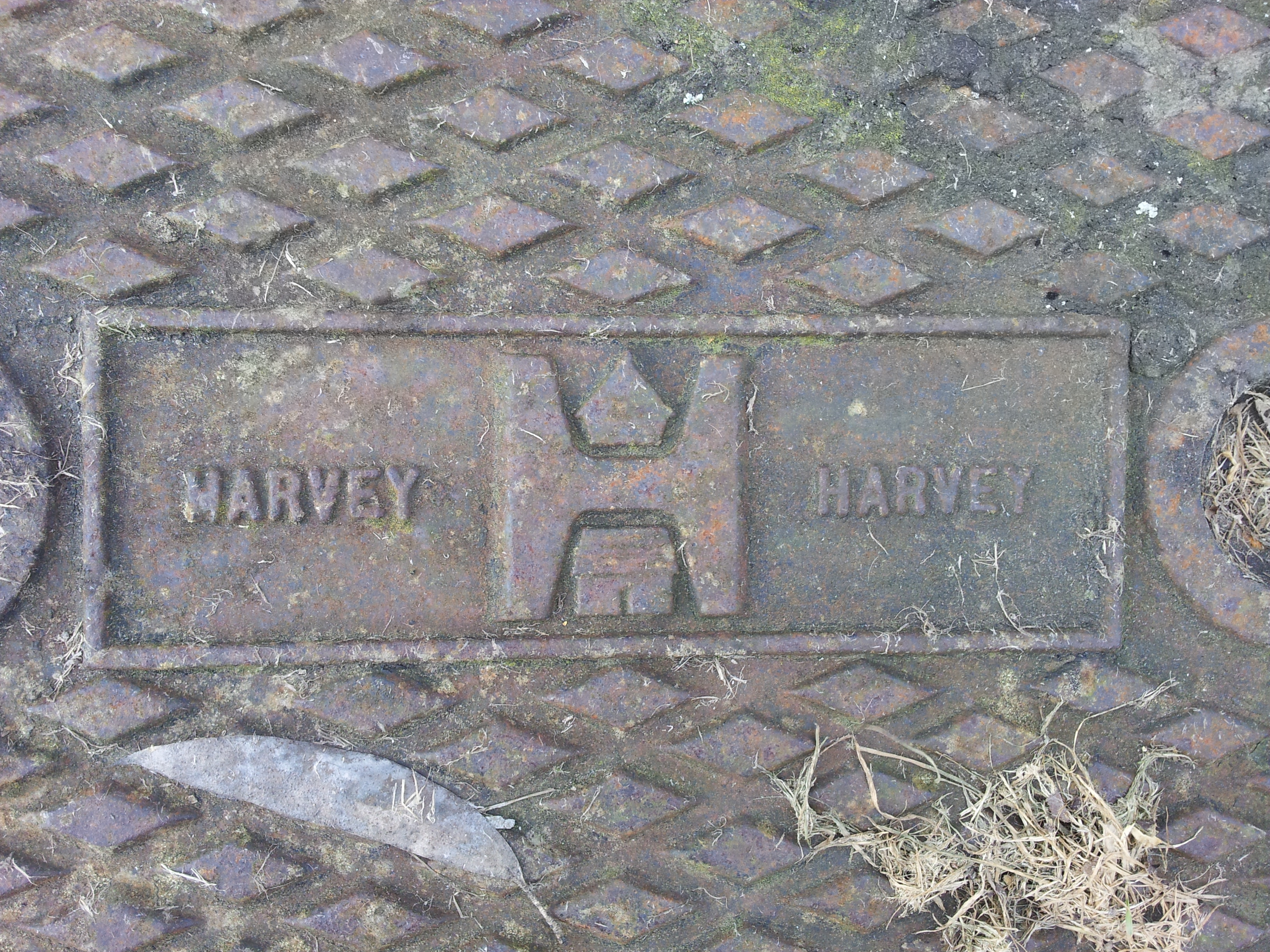 The mark of Harvey on a manhole cover, outside fire station Old County Hall, Truro.