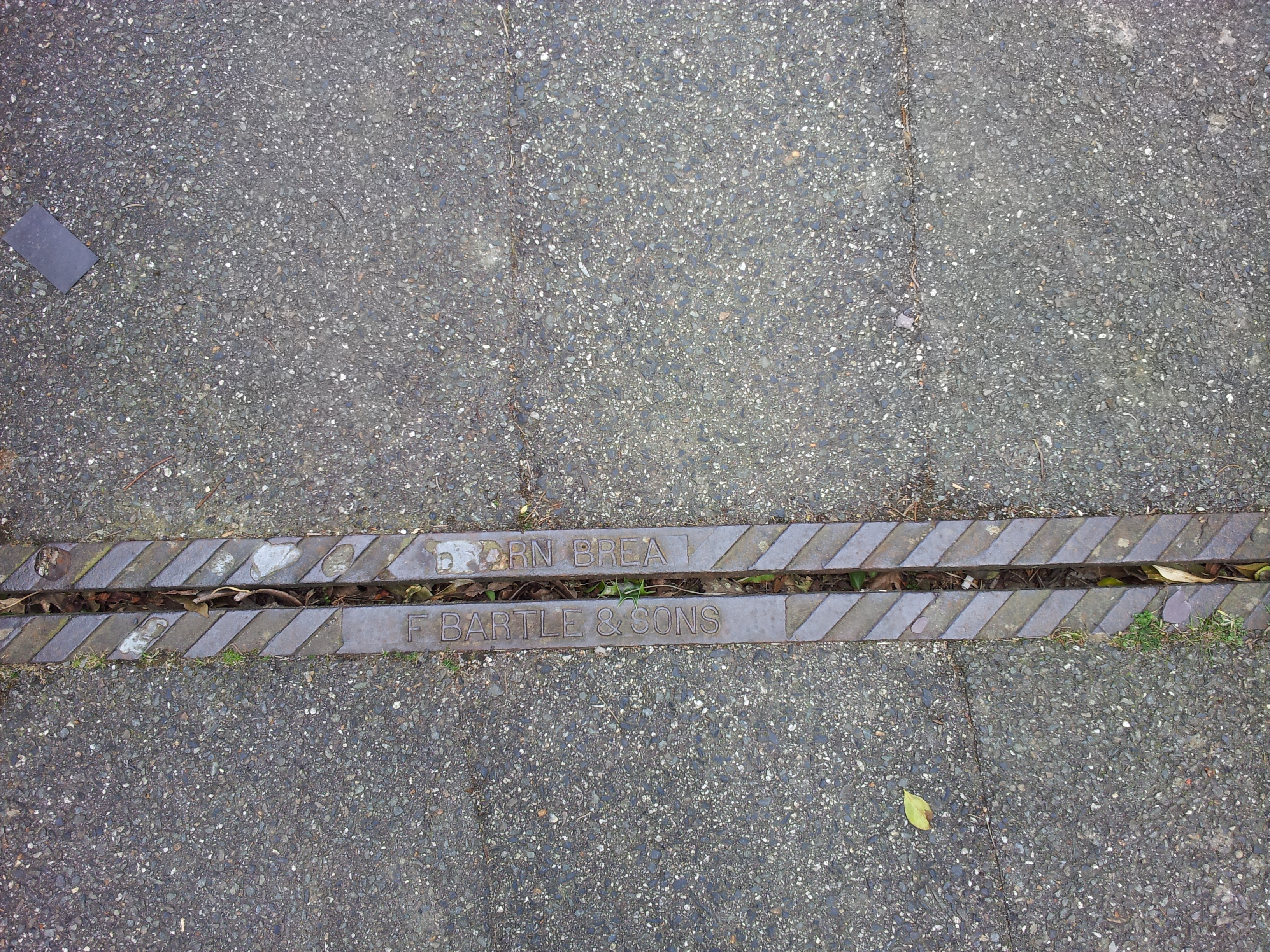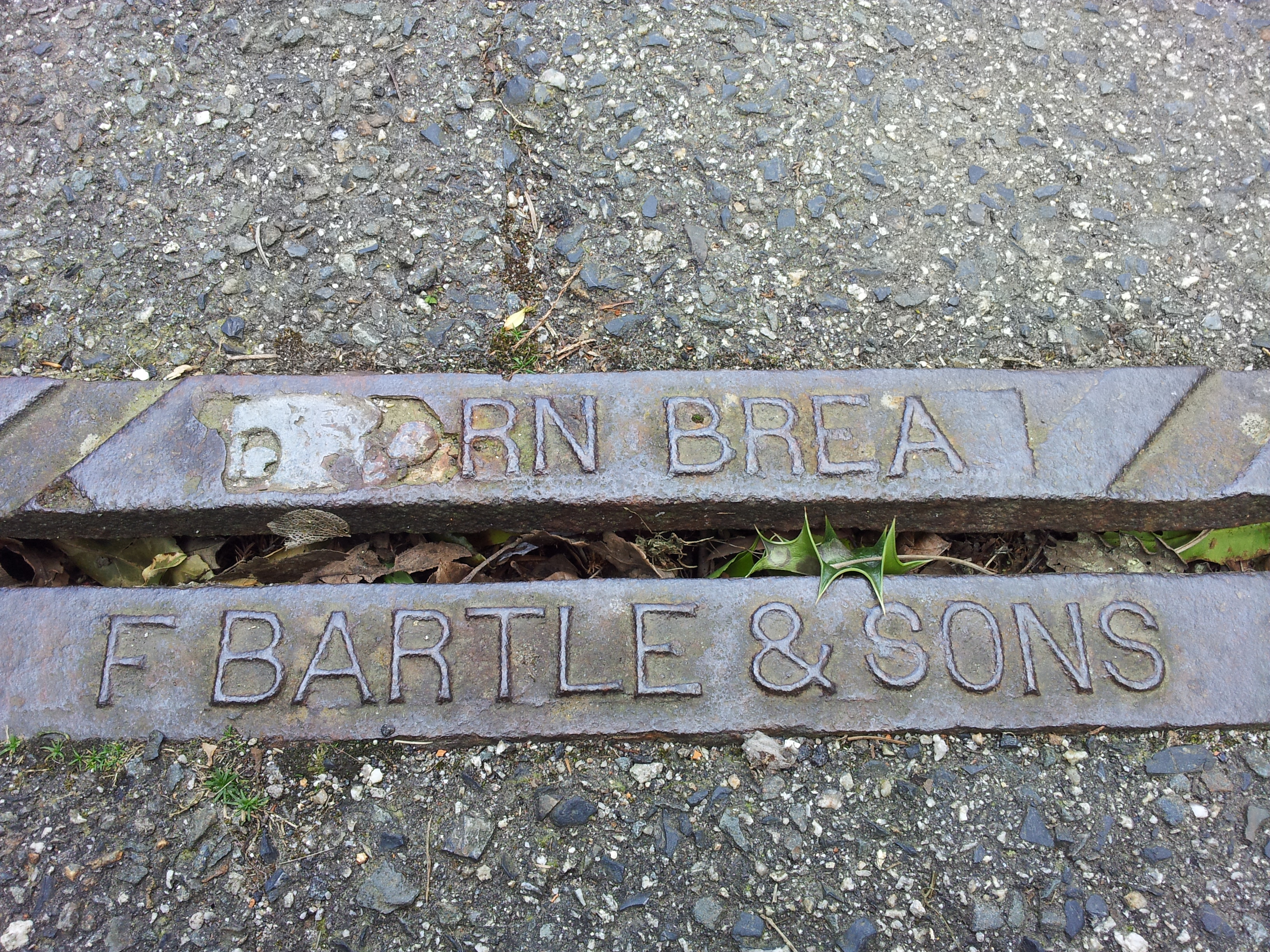 The worn mark of F. Bartle and Sons, Carn Brea on a pavement drain, Avondale Road, Truro.