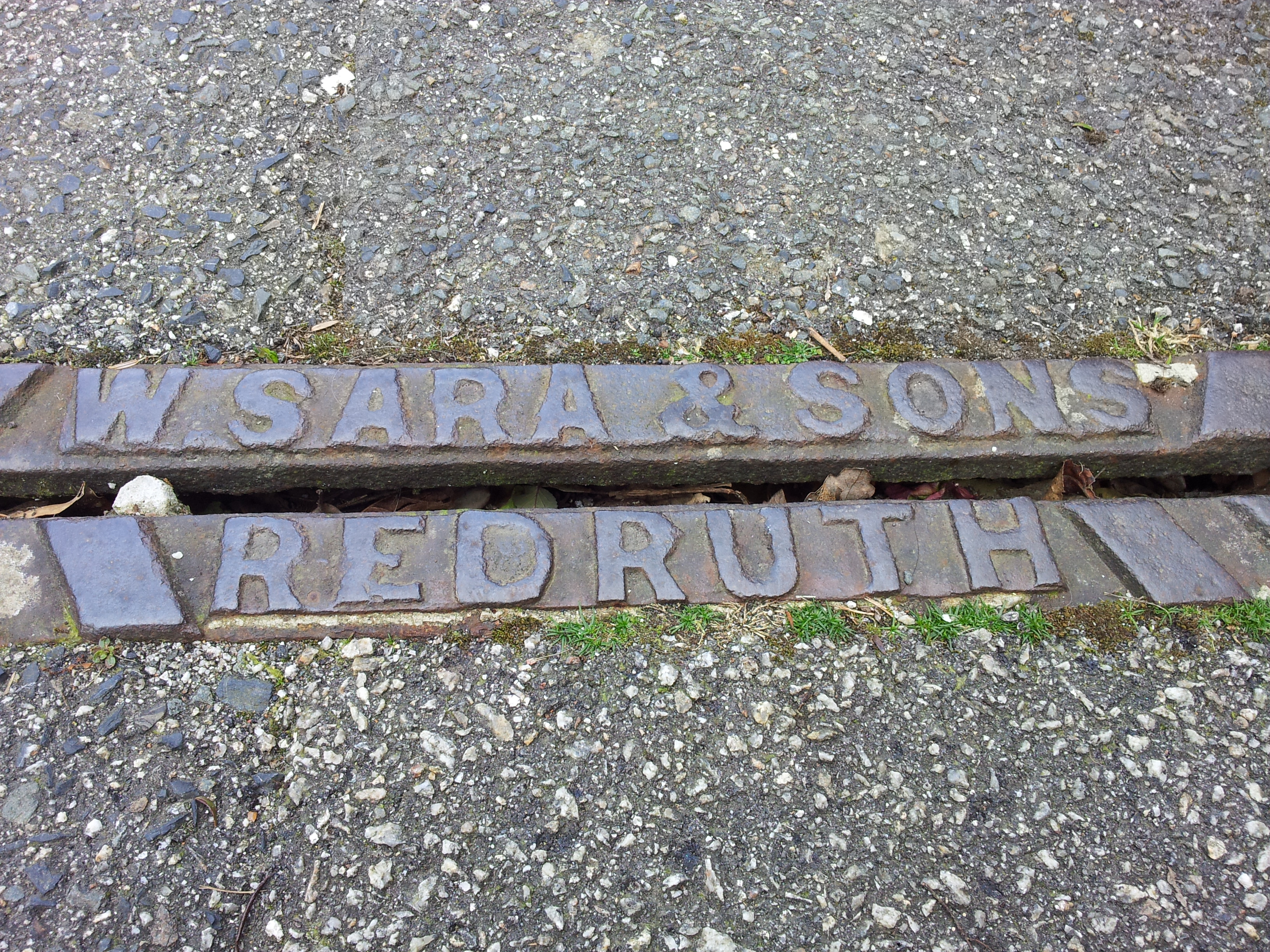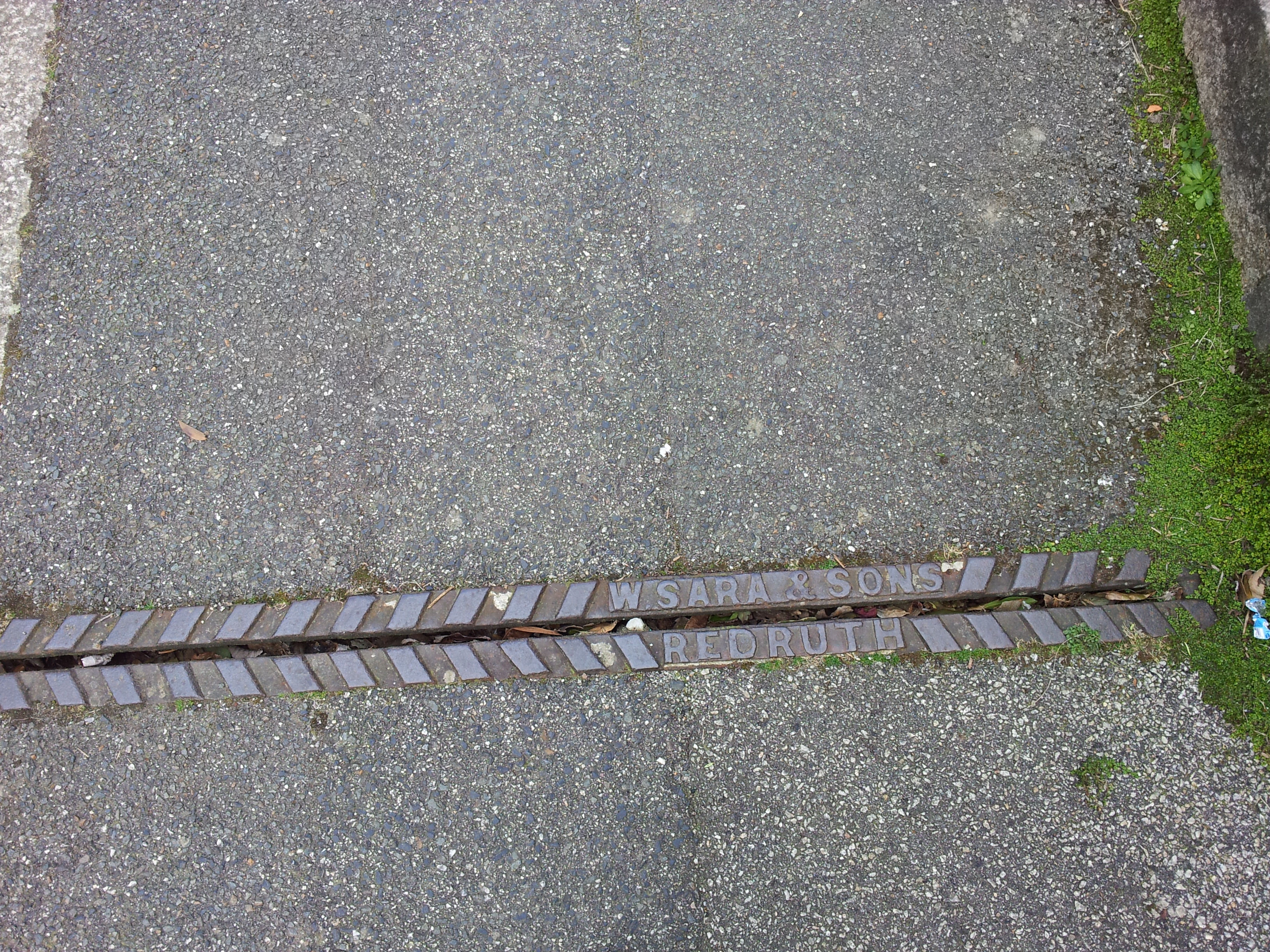 The mark of W. Sara and Sons, Redruth on pavement drain, Avondale Road, Truro.