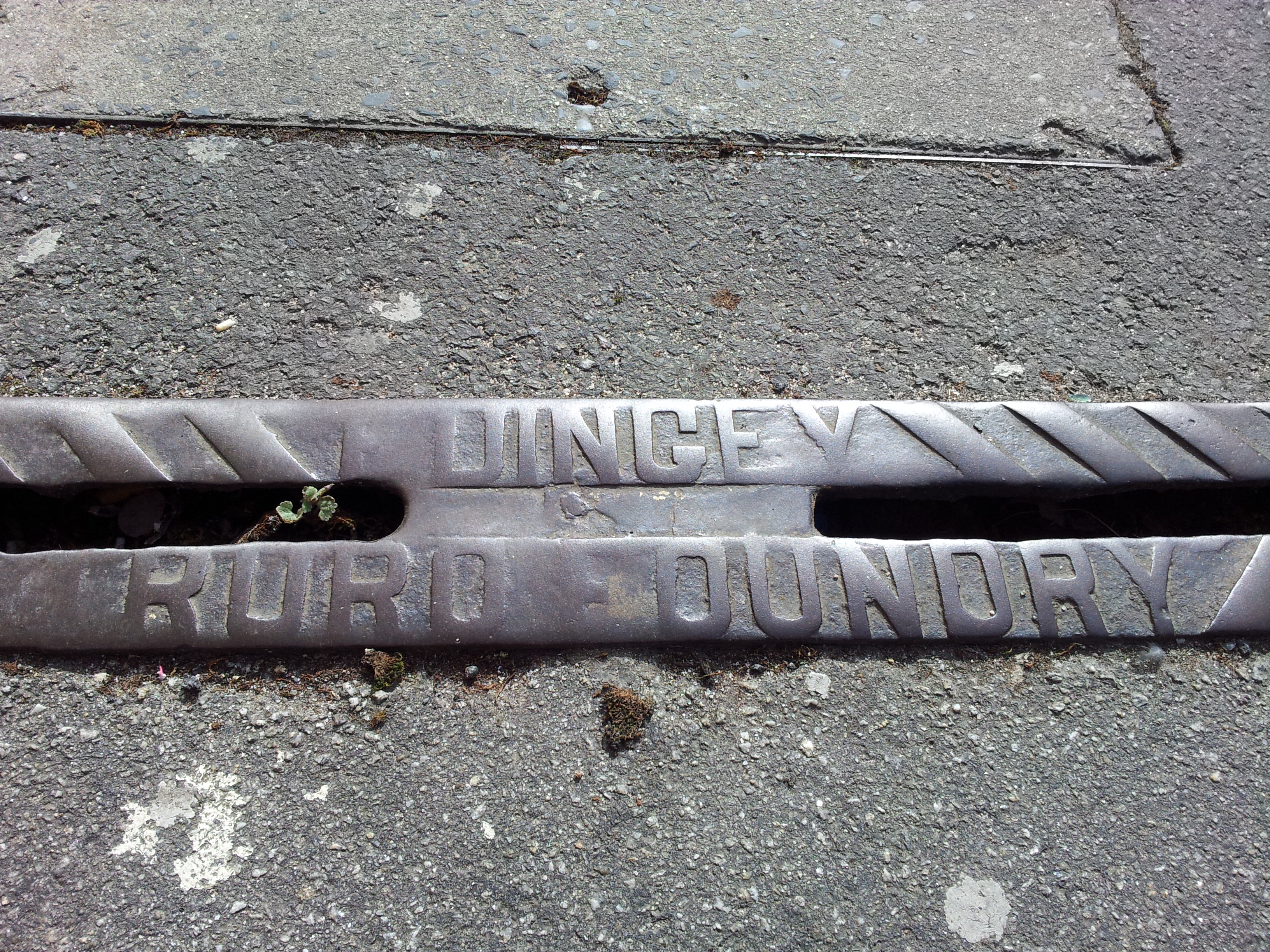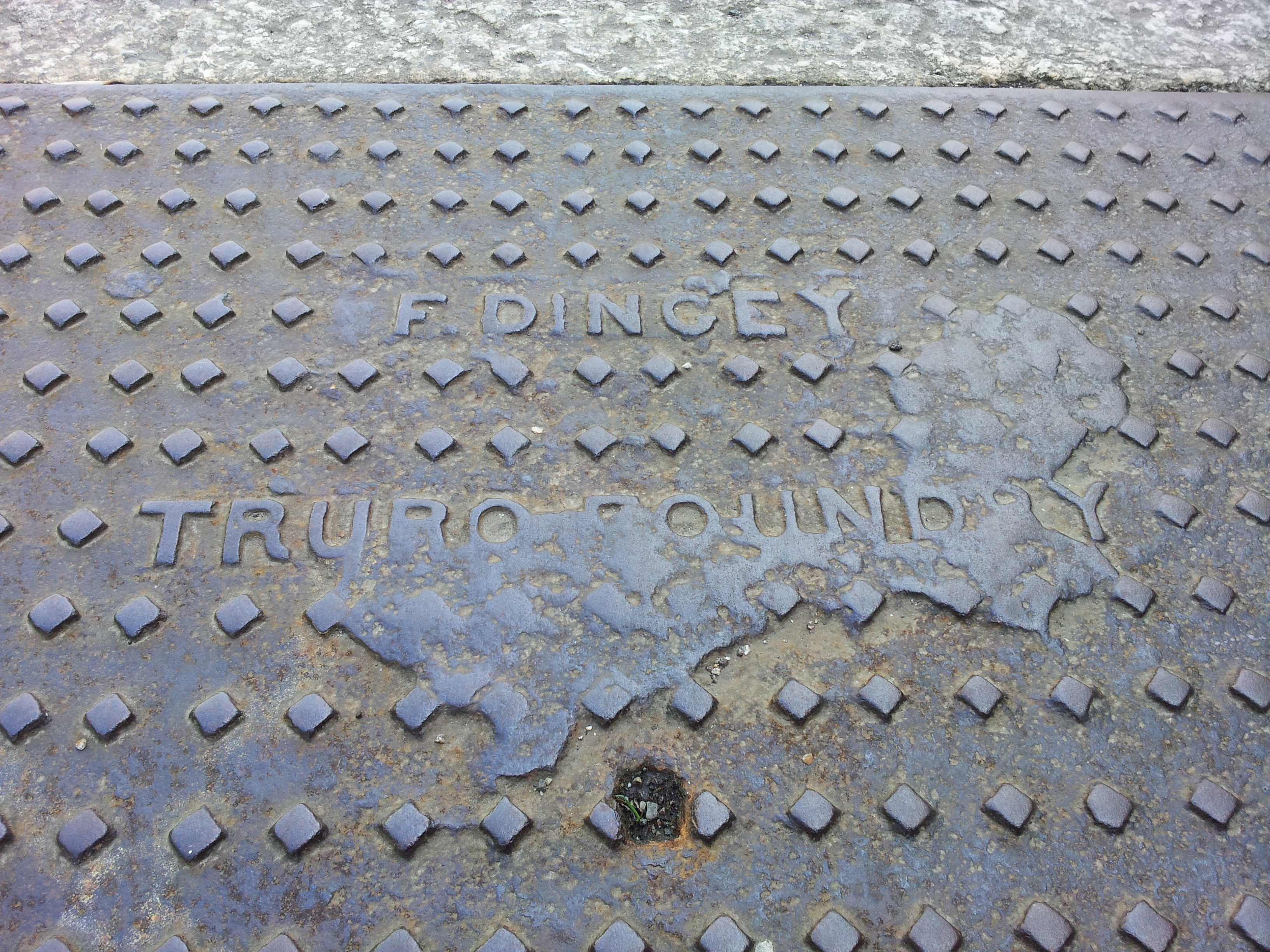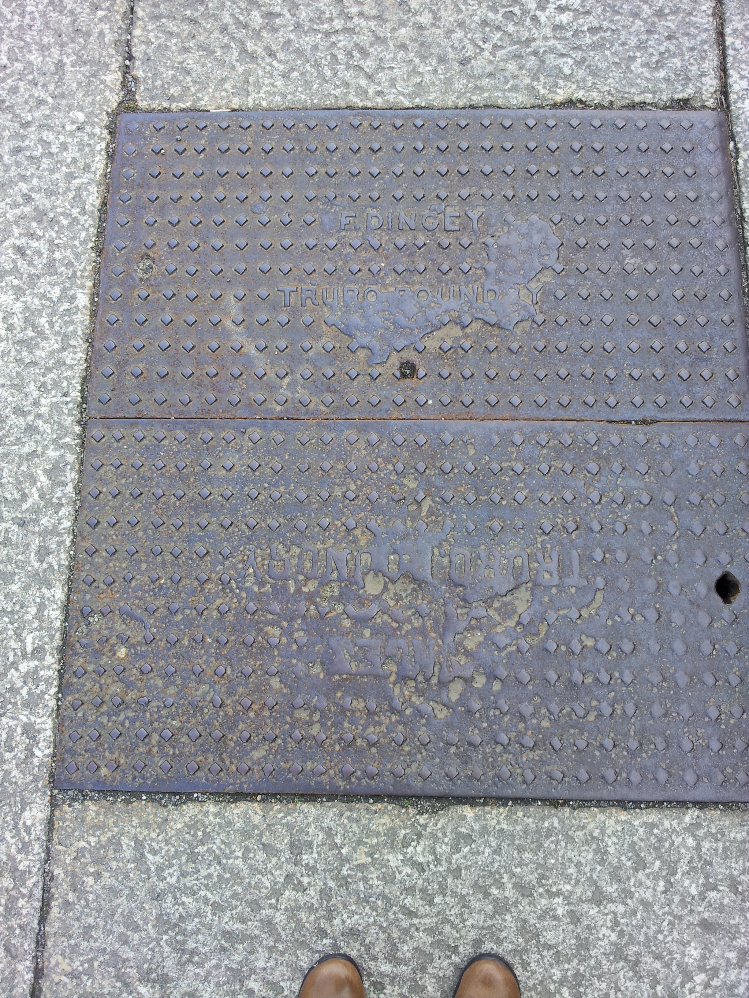 F. Dingey Truro Foundry mark on a pavement drain.