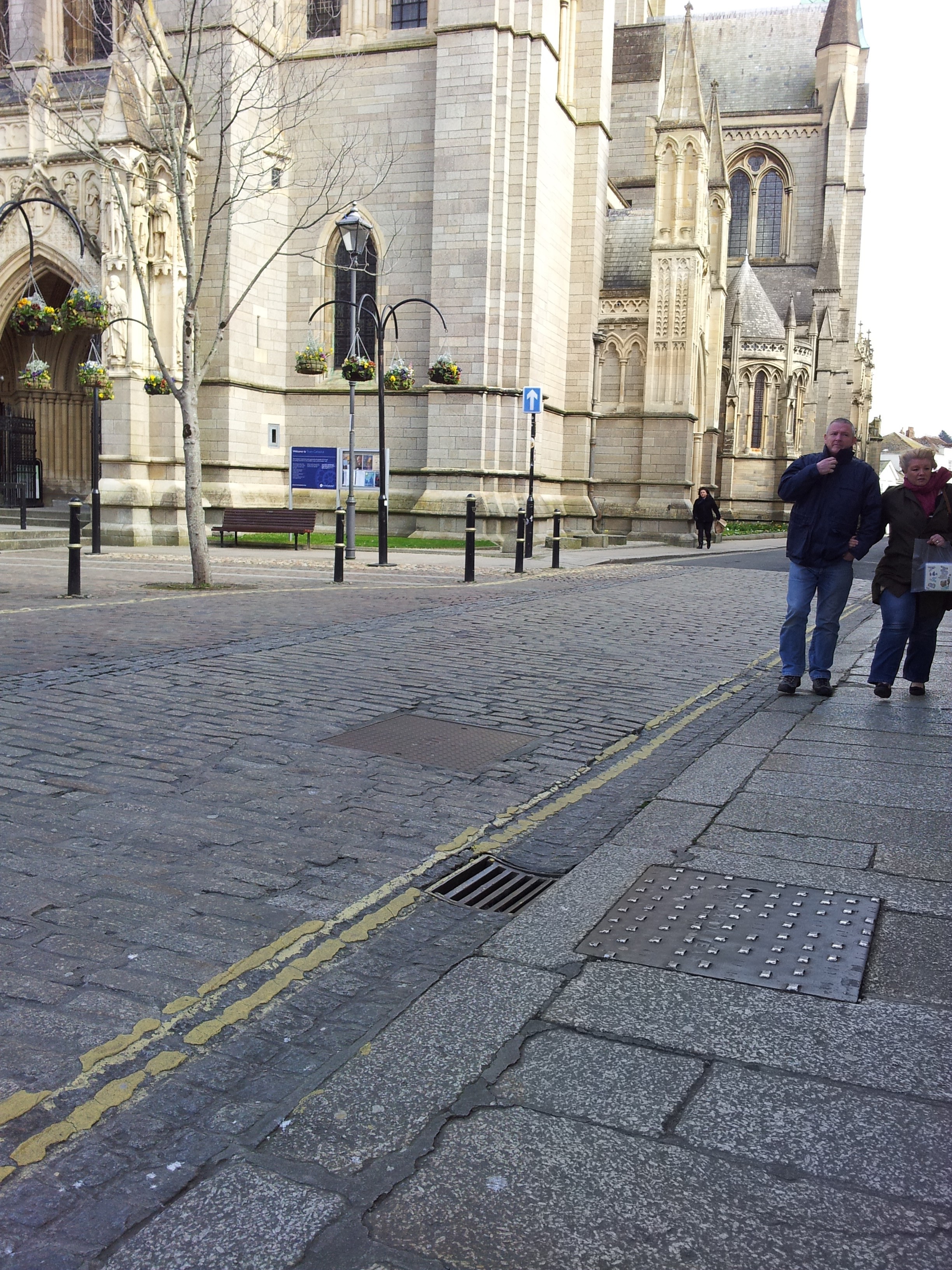 Manhole covers and gutter grill at High Cross, Truro Cathedral.
